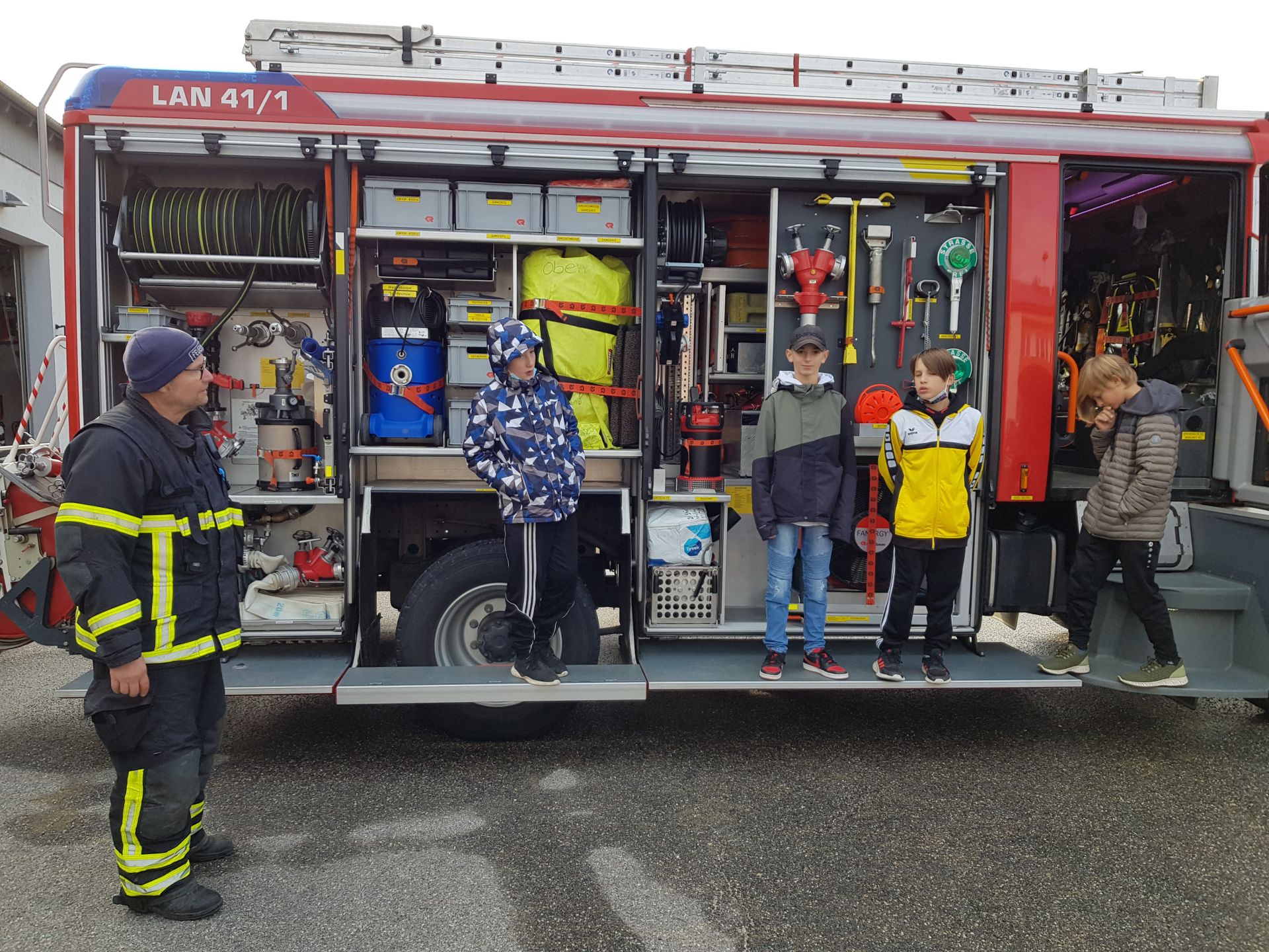 Robert Brandhofer und Bernt Gradwohl führten die Klasse 7b durch die Maschinenhallen und erklärten die Fahrzeuge. Viel Interessantes gab es dabei für die Jugendlichen zu erfahren: dass ein Schutzanzug um die 1500 Euro kostet, wussten die Schülerinnen und Schüler bisher nicht. Auch die Rettungsschere, die z. B. bei schweren Unfällen zum Einsatz kommt, durften die Kinder „bedienen“.