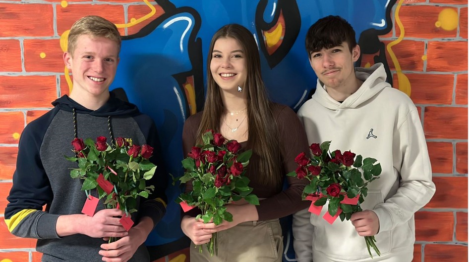 Traditionell sorgt unsere Schülermitverwaltung am Valentinstag dafür, bei uns an der Schule Freude zu bereiten. Und das ist dem Team um Sina Steinhuber heute fast 100-fach geglückt. Im Verlaufe der ersten beiden Stunden wurden die Rosen - übrigens Fairtradeprodukte (versteht sich als Fairtradeschule;-)) - meist an die junge „Frau“ gebracht und sorgten für lächelnde Gesichter.