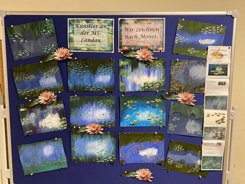 Im Kunstunterricht beschäftigen sich die Jugendlichen der Klasse M8d derzeit mit Claude Monet, einem wichtiger Vertreter des Impressionismus. Neben verschiedenen Infos über den Künstler und die Epoche durfte da natürlich auch die Praxis nicht fehlen. Die wirklich tollen Bilder der SchülerInnen verschönern nun unsere Aula. Das habt ihr echt super gemacht!