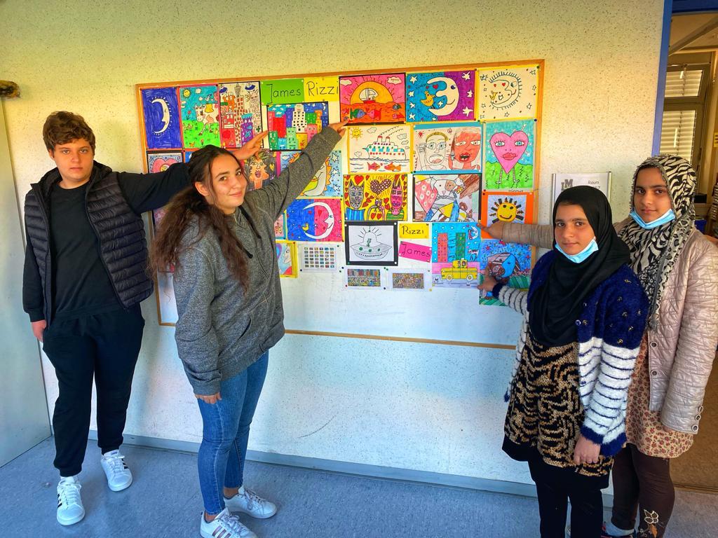 Gemeinsam mit Klassenleiterin Christine Knauer und Tanja Ramizi zeichneten die Kinder und Jugendlichen der Deutschklasse im Kunstunterricht nach Vorlagen des bekannten Künstlers James Rizzi wirklich sehr ausdrucksstarke und tolle Bilder. Diese schmücken jetzt nicht nur den Gang vor dem Klassenzimmer, sondern verschönern auch eindrucksvoll die Klassenzimmertür. Respekt! Das habt ihr echt super gemacht!!