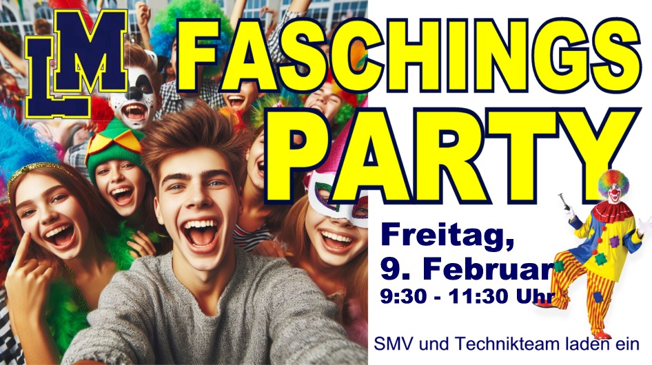 Am Tag vor den Faschingsferien lassen wir wieder die Aula beben! Am Freitag, den 9. Februar findet wieder unsere berühmt - berüchtigte Faschingsparty in der Aula statt.