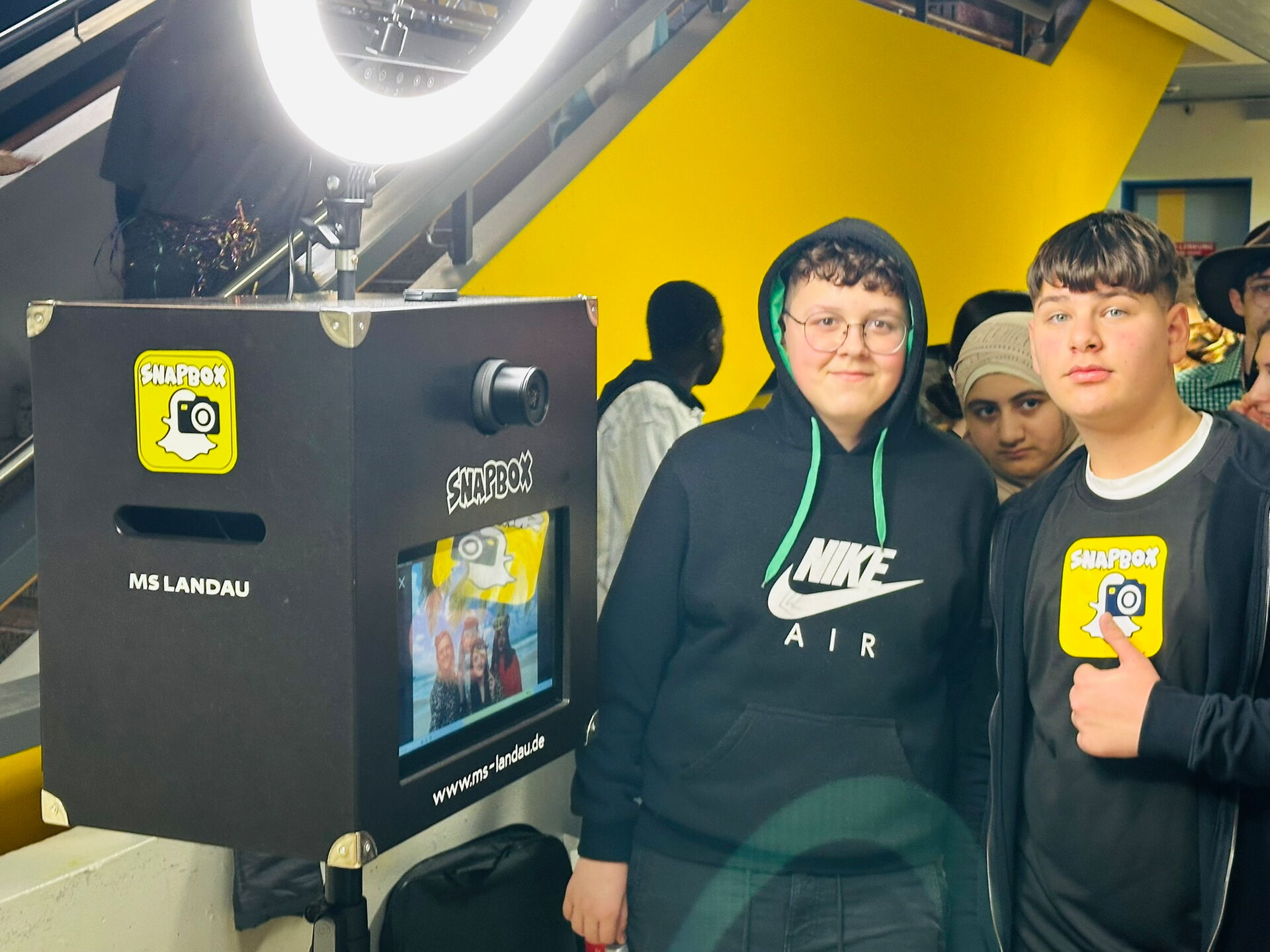 Auch die SMV und das Technik-Team freuten sich über den großen Andrang. Sie hatten die Station vorbereitet, betreut und dafür gesorgt, dass alles reibungslos funktionierte. Die SNAPBOX wird betrieben durch die Klasse 7A, die sich mit viel Engagement um Aufbau, Betreuung und Zubehör kümmerte.