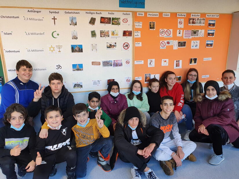 Seit Wochen wird in der Deutschklasse das Thema Weltreligionen erarbeitet. Mit vier christlichen und 11 muslimischen Schülern waren natürlich die Religionen Christentum und Islam sehr interessant. Aber auch das Judentum, der Hinduismus und der Buddhismus weckten Interesse. Anhand von Steckbriefen und Bildern wurde oft genüg geübt, sodass die Schülerinnen und Schüler nun das große Steckbild auswendig können.Diese tolle Arbeit musste natürlich die Leinwand vor dem Klassenzimmer schmücken.Wusstest du, dass die Juden auch kein Schweinefleisch essen? Dass die Hindus kein Rindfleisch essen? Oder dass die Muslime 30 Tage lang von Sonnenaufgang bis Sonnenuntergang fasten? Schau doch mal vorbei, um vieles über die Religion deiner Mitschülerinnen und Mitschüler zu erfahren und um ganz interessante Gemeinsamkeiten herauszufinden...