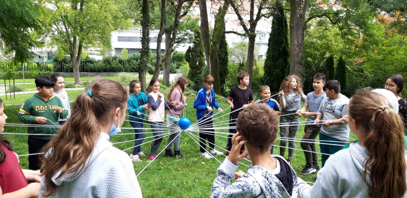 Auch die Klasse 5a mit Klassenleiterin Frau Schobner durfte am Dienstag einen spannenden Vormittag im Mehrgenerationenpark verbringen. Frau Plötz lud nämlich zu einem Kennenlern-Vormittag ein. Voller Erwartung startete der Tag mit einer Runde spannender Fragen. Ein Spiel jagte das nächste, bis die Klasse schließlich mit jeder Menge Schätzaufgaben zu tun bekam: „Wie viele Haustiere gibt’s in unserer Klasse?“ – „Wie viele Geschwister haben wir alle zusammen?“ – „Wie viele Knochenbrüche hatten die Schüler zusammen schon?“. Die Antworten waren allesamt verblüffend. Die erste große Challenge fand am späten Vormittag statt, als die Klasse zusammen 12 verschiedene Aufgaben innerhalb 45 Minuten erledigen musste. 200 Liegestütze, Bilder von Autos, Tieren oder verschiedenen Blumen waren gefragt. Auch sportlich gings zur Sache: 200 Liegestütze, Klimmzüge oder Purzelbäume waren gefragt. Da war gute Absprache und geschicktes Verteilen der Aufgaben gefragt. Bravourös wurde auch diese Herausforderung gemeistert. Am Ende des Vormittags stand noch das Thema Schafe-Hüten auf dem Programm. Knifflige Aufgaben mit Seilen oder Holzstäben mussten in Gemeinschaft erledigt werden. Am Ende des Vormittages kannte nicht nur Frau Plötz wirklich jeden Vornamen – auch die Schüler untereinander erfuhren jede Menge Interessantes voneinander. Man war sich einig, dass die Klassengemeinschaft wirklich super funktionierte und man im Team viele knifflige Aufgaben lösen kann.